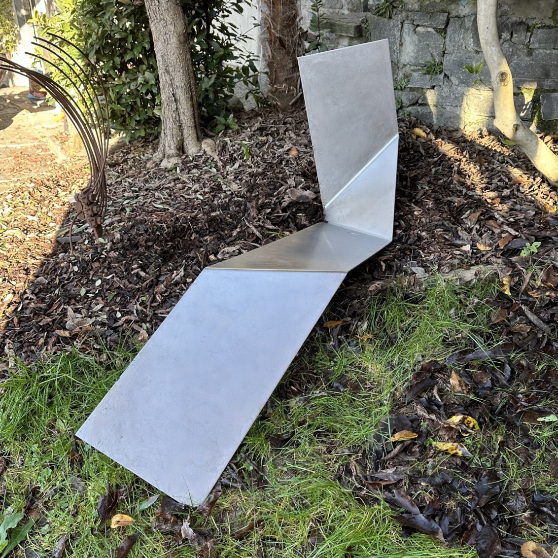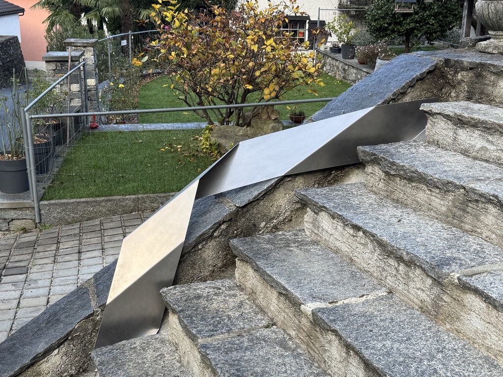 Das erste Objekt ist fest montiert. Es schleicht am Rande die rustikale Treppe hoch und begleitet die Besucher zur Liegenschaft. Es entsteht ein Kontrast zwischen scharfkanntigen Oberflächen zum rauen Granit der Treppe. Es wirkt fast schwebend, wie hingelegt und die Oberflächen reflektieren immer wieder andere Grautöne. Chromnickelstahl 2010 cm